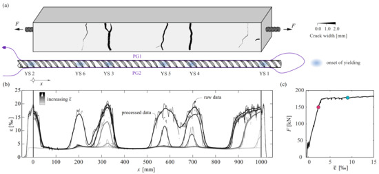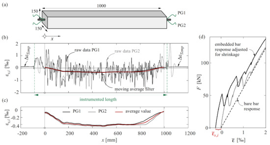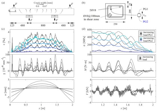 Figure 12a,b illustrate the experimental setup, the geometry and reinforcement layout, and the instrumentation of the investigated reinforcing bar relevant in the present context, consisting of two vertically aligned polyimide-coated fibre optical sensors PG1 and PG2.