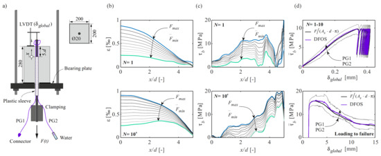 To assess the plausibility of the results obtained with DFOS, the bond shear stress values were averaged over the bonded length and compared to the nominal values obtained by dividing the applied load by the perimeter of the bonded length of the reinforcing bar. Figure 11d shows the results for the first ten load cycles (top) and the loading up to failure (bottom) after the millionth cycle; note the different scales of the abscissa. The results show an excellent agreement between the two independent methods to determine the bond shear stresses.