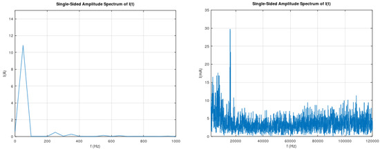 A characteristic example of devices that produce electric currents with frequencies in the range of supraharmonics are inverters. Inverters are employed to convert DC to AC electric power, as in the case of photovoltaic (PV) systems. Electric-current quality has been able to be monitored and analyzed up to about 3 kHz until the present, due to the lack of knowledge on how supraharmonics could affect the power quality and the critical infrastructure [12,13]. The existence of supraharmonics in low-voltage networks, due to power electronics, was verified by the authors through measurements in an 8 kWp rooftop PV installation. The initial measuring system was simple enough, as it consisted of a digital oscilloscope (Gwinstek GDS-2102 A) in combination with a current probe (ELDITEST CP6220). These measurements verified the existence of supraharmonics on the current waveform at the AC side of the inverter. Figure 1 illustrates the measured electric current at the AC side of the inverter, while Figure 2 illustrates the analysis in the frequency domain for this measured current. From Figure 2, it is observed that the electric current at 50 Hz (the basic power-grid frequency) is about 11 A, while at 16 kHz, the corresponding current is about 30 mA, which imposes a harmonic distortion due to the 16 kHz component, of 0.27%.