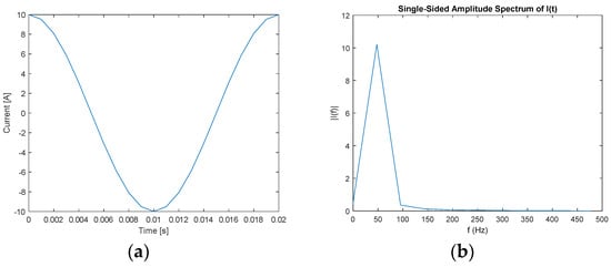 An example of using FT on a sinusoidal signal for an electric current at 50 Hz with an amplitude of 10 A is illustrated in Figure 3.