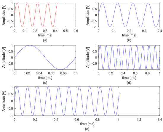 Example of different observation windows of the same sinusoidal signal at 10 kHz in the time domain. Observation time interval includes (a) four full periods of 10 kHz signal, but it is not an integer multiple of the 10 kHz signal period (0.42 ms); (b) exactly four full periods of 10 kHz signal (0.4 ms); (c) exactly one full period of 10 kHz signal (0.1 ms); (d) exactly ten full periods of 10 kHz signal (1 ms); and (e) ten full periods of 10 kHz signal, but it is not an integer multiple of the 10 kHz signal period (1.01 ms).