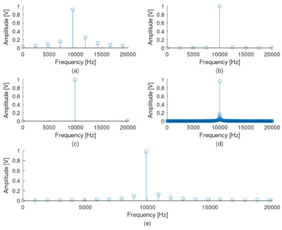 FFT results of the same sine signal at 10 kHz in the frequency domain, when different observation windows at the time domain are used. Observation time interval includes (a) four full periods of 10 kHz signal, but it is not an integer multiple of the 10 kHz signal period (0.42 ms); (b) exactly four full periods of 10 kHz signal (0.4 ms); (c) exactly one full period of 10 kHz signal (0.1 ms); (d) exactly ten full periods of 10 kHz signal (1 ms); and (e) ten full periods of 10 kHz signal, but it is not an integer multiple of the10 kHz signal period (1.01 ms).