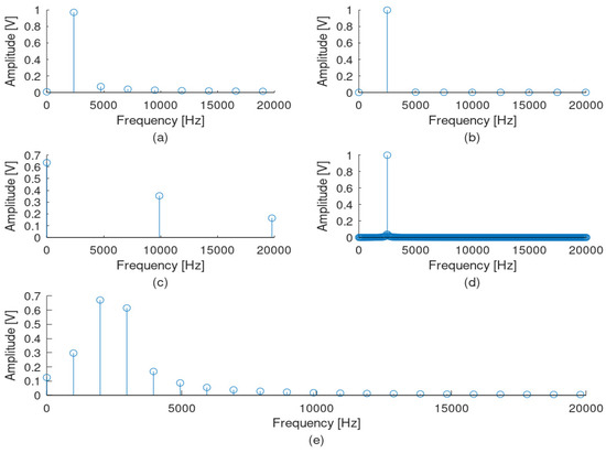 FFT results for the sine signal at 2.5 kHz in the frequency domain, when different observation windows at the time domain are used. Observation time intervals are (a) 0.42 ms, (b) 0.4 ms, (c) 0.1 ms, (d) 1 ms and (e) 1.01 ms.