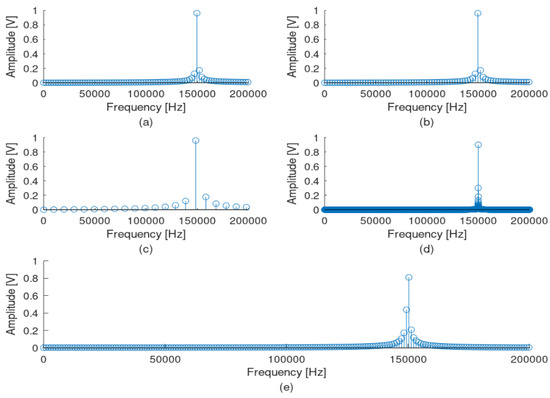 FFT results of the sine signal at 150 kHz in the frequency domain, when different observation windows at the time domain are used. Observation time intervals are (a) 0.42 ms, (b) 0.4 ms, (c) 0.1 ms, (d) 1 ms and (e) 1.01 ms.