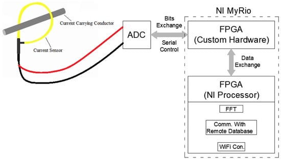 The control of the ADC and the FFT implementation were developed on an FPGA-based device called MyRio. The embedded FPGA in this device is the Xilinx Zynq-7010 [23,24]. This device is capable of being programmed using the LabVIEW graphical language and supports the import of VHDL codes. VHDL code is a type of hardware description language. It is used for the description of hardware structure over an FPGA or a complex programmable logic device (CPLD) [25].
