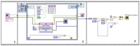 LabView code used for the design of the proposed measurement system. 1. First frame of the code embeds the VHDL code; 2. Second frame is a loop structure with 1MHz clock; 3. Third frame is the FFT analysis.