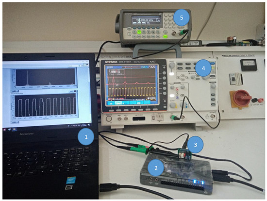 Experimental setup for the tested system. (1) PC screen; (2) MyRio device; (3) Custom ADC card; (4) Oscilloscope; (5) Pulse generator.