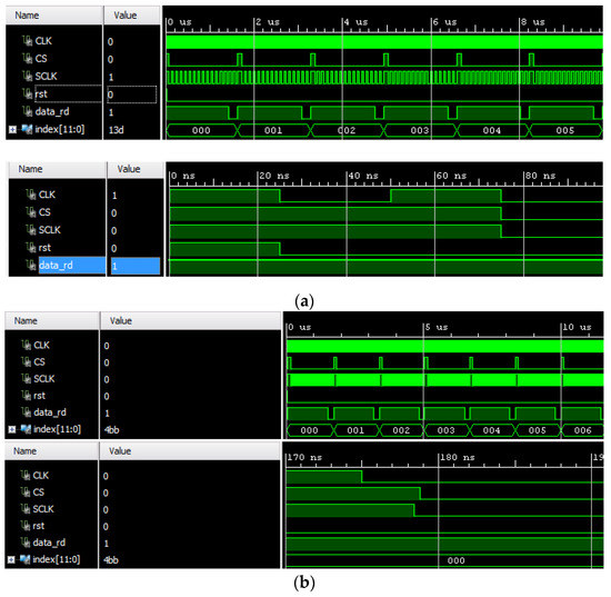 The ADC control was described in VDHL as already mentioned. The ADC resolution, which can be up to 10 bits, was VDHL parametric, and the developed system set up used a 10-bit resolution for test purposes. That means that 5 V of measured signal represented a value of 210 − 1 = 1023. Figure 17 illustrates the simulation results for the VDHL code that controlled the external ADC.