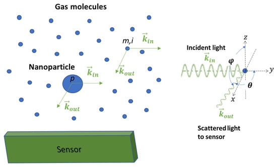 Because gas molecules surround a nanoparticle, a detector should sense the light intensity instead of the light intensity . The more exact particle light scattering phenomenon described by Equation (2) provides another strategy to ensure that the intensity is above the sensor sensitivity, which is to increase the intensity of light scattered from the n molecules surrounding the particle. By adjusting the incident light power or sensor settings, the intensity can be used as an adjustable parameter relative to the threshold of the sensor, while the intensity can be added to this adjustment because of the superposition principle. For example, the intensity can be adjusted so that without a particle and with a particle are all in the detectable regime of the sensor. In this way, the detection of nanoparticles results from comparing the difference between and . Typically, the sensor detection space is much larger than the one-nanoparticle n-molecule analysis space used for deriving Equation (2). When using an image-sensing technique, both and can be observed simultaneously. The molecule light scattering image of can be displayed as a background for the particle light scattering image of , so that the particle can be displayed as a brighter dot image with the molecule light scattering background.
