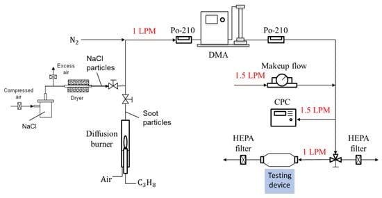 A standard particle calibration system was used to generate standard aerosols for checking the detection capability of the detector as shown in Figure 3 [12]. The aerosol particles used for the calibration were NaCl particles generated with a collision-type atomizer and soot particles generated using a home-made diffusion burner, as presented on the left-hand side of Figure 3. NaCl particles served as dielectric particles that were consistent with the conditions required to derive the Rayleigh light scattering equation (Equation (1)) and the aerosol light scattering equation (Equation (2)). NaCl particles are not autofluorescent, and thus, were able to eliminate undesired light emissions, especially when a short wavelength laser was used. Soot particles are typical light-absorbing particles and are a type of air pollutant of research interest. The monodisperse distribution of the particles was achieved by passing them through a charge neutralizer of a radioactive source Po-210 and a differential mobility analyzer (DMA) in the system. After passing through another neutralizer to neutralize the charges on particles exiting the DMA, the particle concentration was checked with a condensation particle counter (CPC), which condensed butanol vapor on the aerosol, with a minimum detection limit of 2 nm. The monodispersed particle was then sampled by the CPC (reference instrument) and the testing device simultaneously, as shown in Figure 2. During the particle detection, the flow through the device was stopped and monodisperse particles were trapped in the detecting space of the testing device. Makeup flows were used to adjust the concentration of particles generated and maintain the DMA and CPC operated under their designed conditions.