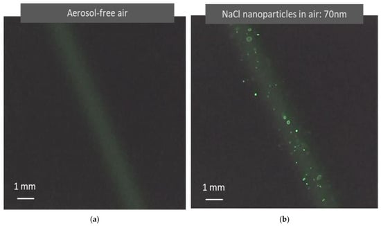 Light scattered from air molecules is typically difficult to observe, especially when using a low-power laser with a large beam size. Traditionally, a light beam becomes visible only when colloidal particles are present, which is called the Tyndall effect [13]. In recent years, laser technology and imaging sensing technologies have made tremendous progress, making the observation of light scattered by air molecules much easier than before. Using a simple testing device as shown in Figure 2, light scattered from air molecules is clearly visible in a video recorded with no aerosol, as shown in Figure 4a. In the video, the background scattered light from the air molecules appears relatively uniform. Figure 4b shows a photo from a video recorded when 70 nm monodisperse NaCl aerosol particles are present in the air. The light scattered from the particles shows particle motion against the background of scattered light from the air molecules. This observation agrees with the image superposition described in the aerosol light scattering equation (Equation (2)). In the photo shown in Figure 4b, there is a size difference in the particle light scattering images. By tracking the movement of the light scattering images of individual particles, it is observed that the size difference in the particle scattering images is produced when the particles are located at different distances from the detector.