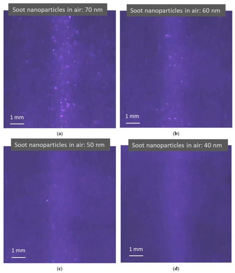 Figure 5 shows four photos taken from four videos that record light scattering images when four different sizes of monodisperse soot particles are in the air. The concentrations of soot particles used in the test in the figure are 1.7 × 105, 1.3 × 105, 8.8 × 104, and 4.6 × 104 particles per cubic centimeter with a standard deviation of 7.5 × 102, 8.4 × 102, 4.1 × 102, and 3.8 × 102 for 70, 60, 50, and 40 nm soot particles, respectively, as measured using a CNC shown in Figure 3, with an uncertainty of ±5% in the concentration range. As shown in the previous figure, the light scattered from the air molecules is adjusted to be visible to the image sensor. Compared to dielectric NaCl particles, soot particles are light-absorbing particles with a certain electrical conductivity. Images of light scattered from the particles and the background air molecules are still observed. Although there are some distortions in the images, a trend can be observed, in that the smaller the particles, the smaller and darker the particle images.