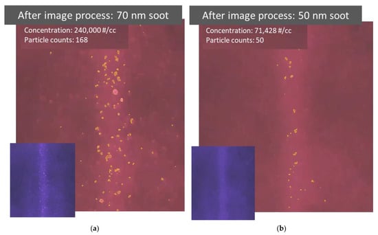 The image information collected in particle detecting videos can be further converted to quantitative information through an image processing code based on a simple contour detection [14]. Figure 6a,b show the results after the quantitative information was extracted from the videos detecting 70 and 50 nm soot particles, respectively. As shown in the photos, the particles identified by the code are highlighted with a yellow outline. The observation volume is determined by the size of the beam and its length in the picture. The count of identified particles in the observation volume and the volume itself are then used to calculate the particle number concentration. The particle count and number concentration are presented near the top-left corner in each processed image. It is quite difficult to see the detected 50 nm particles by eye in the original video. By highlighting the identified particles in the processed video, the detected particles become more visible, as shown in Figure 6b. However, there are some discrepancies between the actual particle concentration and the measured particle concentration calculated using the identified particle counts. For example, the particle concentration converted from the video could be overestimated if the contours of identified particle images are not perfectly described, especially for large particles, or underestimated if the particle identification ratio is low, especially for small particles. The quality of image processing has an important influence on the identification accuracy of particle concentration.