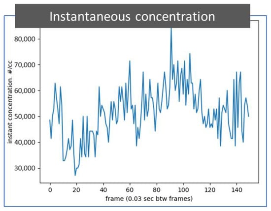 A plot of instantaneous concentration of identified particles. The particle number concentration information is extracted through an image process from 150 photos in a 5 s video while detecting 50 nm soot particles in the air. The particle detection video is the same as presented in Figure 6b. The time between frames is 0.03 s.