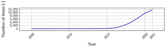 The essence of LPWAN dates back to the 1980s–1990s, when technologies and networks with similar architectures were introduced, i.e., AlarmNet from ADEMCO [], followed by 2G (second generation mobile network) technologies, and many others. However, the modern technological concept recognized as LPWAN started with SigFox in 2009 and continued with many new technologies such as Weightless, LoRaWAN, Ingenu, Waviot, NB-IoT, and others. Moreover, the first relevant scientific papers about LPWAN were published a few years ago, in 2015; since then, interest in LPWAN has grown steadily (see Figure 1).