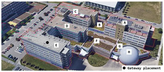 Location of our private one-gateway LoRaWAN experimental network with view of the individual buildings of the Electrical faculty (A–H are the names of the buildings).