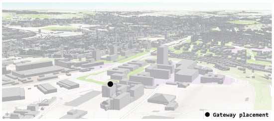 Figure 3 shows the different parts of the university campus. Each letter indicates one part of the building. The gateway was positioned to cover both the building and part of the city in the E-part of the building. Further, the campus building is one of the highest points in the city. The Lorank 8+ gateway was placed on the roof of the E-part of the building of our campus with the coordinates of the site 49.2269133° N, 16.5752194° E. The E-part of the building provides a power panel for outdoor gateways and metal pillars for deployment. Using the 3D preview of the selected area, it can be observed that from the roof of the E-part of the building, which is marked in the picture (black dot), it is possible to observe most of the buildings in the city of Brno in the line-of-sight (see Figure 4). From the selection of multiple positions, this position seemed the most strategic given the above-mentioned parameters.