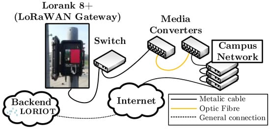 The gateway is connected via a basic commercial switch through the 100 MB/s Ethernet to the campus network. The optical connection was chosen to protect network equipment on campus from lightning damage. For this reason, however, Ethernet-to-optic media converter must be used at the gateway side and optic-to-Ethernet media converter on the campus side of the network. The LORIOT cloud itself is not operated locally on campus, but is run directly on LORIOT’s servers, for which gateway access is through the Internet. The complete network topology is displayed in Figure 5.