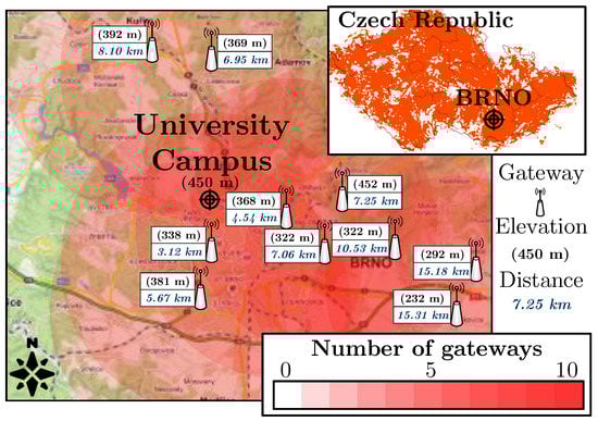 To represent the public network, the LoRaWAN network of the Czech national operator ČRa (České Radiokomunikace) was selected (the coverage is displayed in Figure 6). The estimated coverage is based on the theoretical range of 8 km per gateway [] (the availability was verified in a calibration test in front of the campus building). Therefore, our selected location should be decently covered by the national LoRaWAN operator with multiple nearby gateways. A total of 10 ČRa gateways are located within a radius of 16 km from the university campus. Even though there are several public LoRaWAN providers in the Czech Republic, the selected national operator is the only one covering the whole Czech Republic with hundreds of deployed base stations (WAN area). The other operators mostly provide only local services and their network covers only selected locations (LAN/MAN areas).