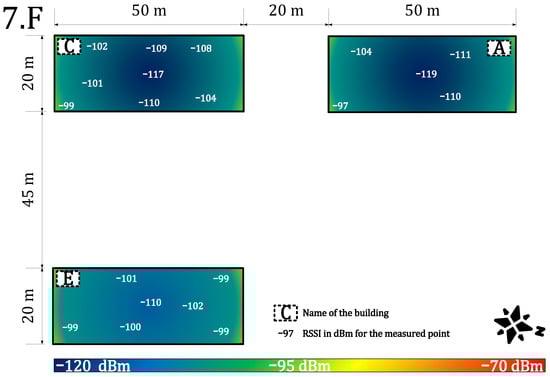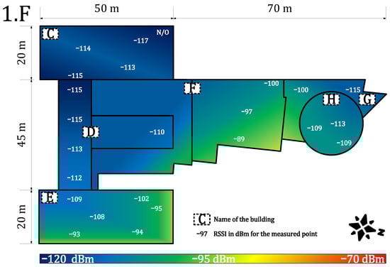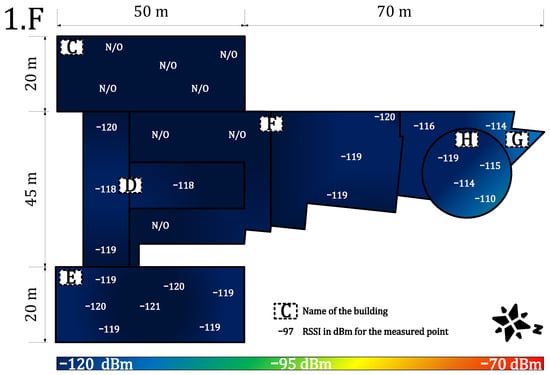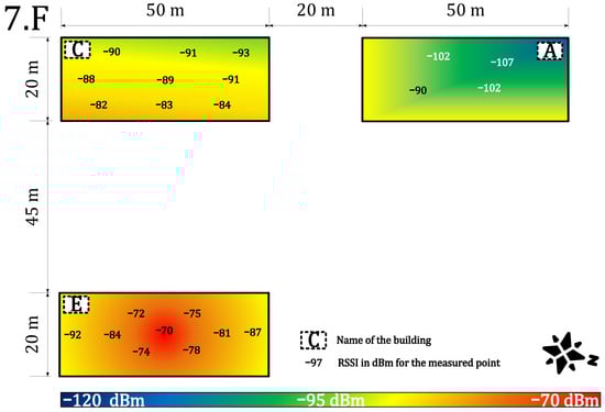 Figure 7 and Figure 8 provide results for both networks on the seventh floor. The public network RSSI ranged from −97 to −119 dBm. The private network RSSI ranged from −70 to −107 dBm with expected best results in the building E (the building with our gateway on the roof). The mean loss rate was <0.1% for both types of network; this allows using both deployments in critical applications requiring >99.9 availability []. However, we observed a higher loss rate (7%) under the gateway (approx. 3 m under a gateway with the reinforced concrete roof in between, the building E—the place with highest RSSI −70 dBm, see Figure 7). Although the private network offers higher RSSI than the public network, the public operator offers sufficient service to cover indoor conditions in this case. Based on the authors’ market knowledge, the 868 MHz traffic will probably become denser in the future due to the growing number of sensors. Therefore, we can expect that the selected channels in the frequency plan will gain a higher noise level and the −119 dBm might become a border value for the sensitivity because the interferences might cause a signal strength degradation of over 20 dB for the LoRaWAN technology [].