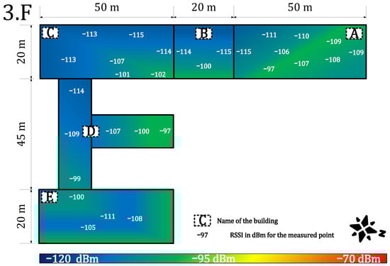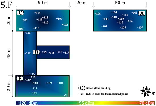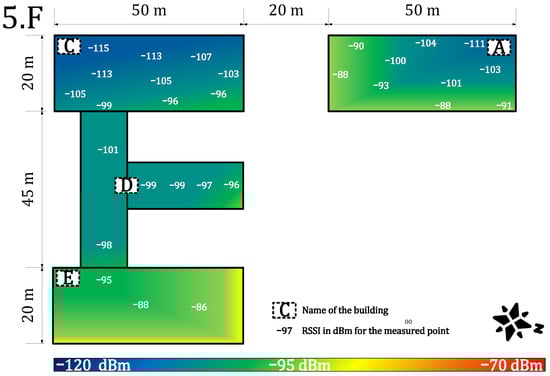 Figure 9 and Figure 10 provide results for both networks on the fifth floor. The private network signal strength was in the range of −86 to −115 dBm with a strength loss of >10 dB in most of the building, except for the building A, where the degradation was minimal due to the line-of-sight between the building and the gateway. The loss rate in the private network grows to 1%. Moreover, the higher loss rate under the gateway in the building E was not observed. On the other hand, the public network signal strength ranged from −98 to −119 dBm. The min/max values are the same as on the previous floor, but the heat-map shows a rapid decrease of the mean RSSI (Figure 10). Further, the average loss rate on the fifth floor grew to 7% in the public network, which allows using it in non-critical indications, metering, and other applications requiring (>90%) availability. On this floor, the private network starts to show a slight advantage.