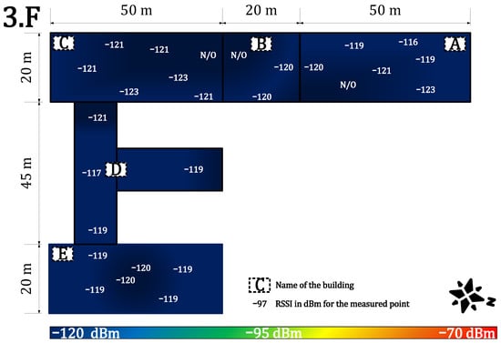 Figure 11 and Figure 12 provide results for both networks on the third floor. The signal strength for the private network was in the range of −97 to −115 dBm. The signal strength dropped again by about 5 to 10 dB and the loss rate increased to 4%. However, the network parameters were stable, and the communication service was available throughout the whole building. An availability of 96% allows using it in most of the metering applications which require (>90%) availability []. Further, the range of RSSI for public networks was in the range of −116 dBm to no signal (N/O). The signal strength also decreased by another 10 dB. Compared with the calibration value, the attenuation is already more than 30 dB, which can be considered as a deep(er) indoor condition. The public service was already unavailable in some parts of the university complex (buildings A, B, and C). In other parts, the service was on the border of the measuring device’s sensitivity. The heat map shows cold signal places throughout the whole building. Further, the average loss rate on this floor increased to 10% for the public network. This is the border value for most of the current applications [].