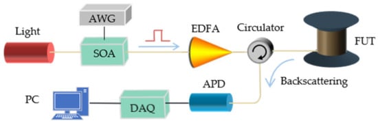 Schematic diagram of DVS system. SOA: semiconductor optical amplifier, AWG: arbitrary waveform generator, EDFA: erbium-doped fiber amplifier, FUT: fiber under test, APD: avalanche photodetector, and DAQ: data acquisition card.