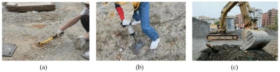 Field tests for collecting vibration signals: (a) hammer, (b) air pick, and (c) excavator.