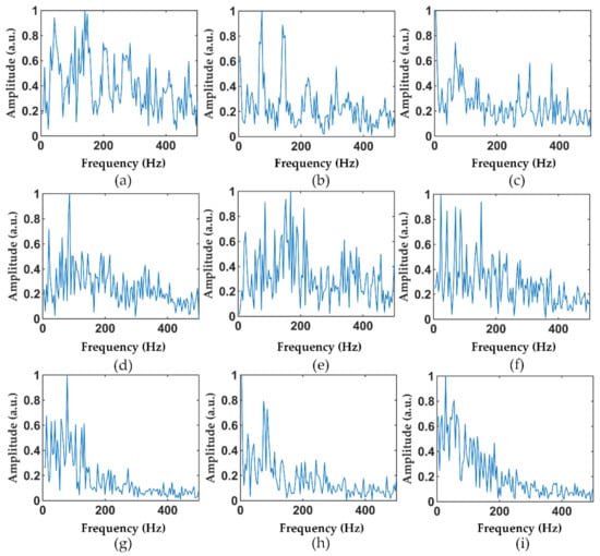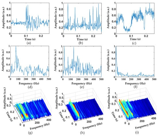 Other samples in the frequency-domain dataset: (a–c) hammer; (d–f) air pick; and (g–i) excavator.