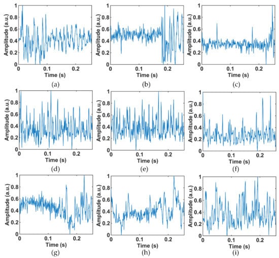 In order to study the impact of different data types on pattern recognition, we performed different processing on the same data to generate multiple datasets. We collected the 1D time-domain data at vibration points to form Dataset2. Shown in Figure 5a–c are the 1D time-domain data of hammer strikes, air pick operation, and excavator operation, respectively. Each sample of Dataset2 has a duration of 256 ms and contains 256 data points. Then, we performed the fast Fourier transform (FFT) on the time-domain data and normalized them to form Dataset3, as shown in Figure 5d–f. Moreover, the short-time Fourier transform (STFT) was applied to the time-domain data to generate the time–frequency data to form Dataset4, as shown in Figure 5g–i.