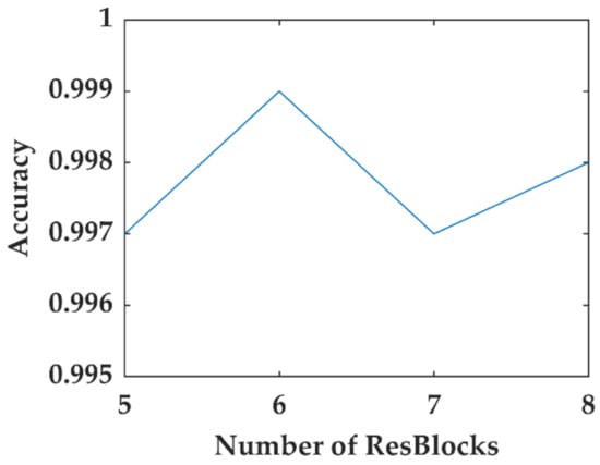 Four CNN models were constructed to establish the optimal network by changing the number of ResBlocks. The average recognition accuracies of Testset1 were verified, as shown in Figure 9. The CNN model with six ResBlocks appeared to be the best option. The architecture of the CNN model is displayed in Figure 10. For comparison, a 1D deep CNN with the same structure was built to process the 1D data, and the sizes of the 1D CNN convolutional kernel are indicated in brackets in Figure 10. Each convolutional layer contained a batch normalization (BN) layer and a nonlinear activation layer.