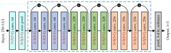 In this experiment, we used a deep CNN to identify and classify the vibration intrusion events. A typical CNN consists of a convolution layer (Conv), pooling layer (Pool), and fully connected layer (FC). Since a CNN needs to recognize the time–space domain signals without manual feature extraction, the original time–space joint features were more complex than the other signal features. There is a high requirement for its feature extraction capability. Generally, a deeper network can improve classification performance, including generalization performance and recognition accuracy [23]. However, the more network layers, the more difficult it is to train. Therefore, we introduced the ResBlock, whose structure is shown in Figure 8b [24]. It established a direct connection between the input and output, resulting in identity mapping so that the model focused on learning the residual between the input and output, thus speeding up the training and improving the network performance [24]. The CNN model, composed by stacking multiple ResBlocks, effectively improved the problem of the training difficulties caused by too many layers.
