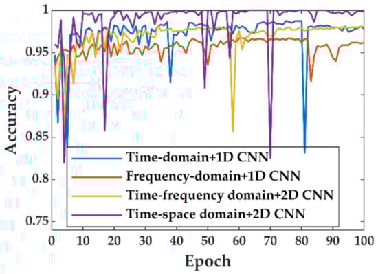 The training sets of Datasets2 and Datasets3 were input to the 1D CNN, and the training sets of Datasets1 and Datasets4 were input to the 2D CNN, respectively. To compare the performance of the different methods, the learning rate, loss function, activation function, training batch, backpropagation algorithm, and the number of iterations of these four methods were all the same. The learning rate was 10−3, the loss function was cross-entropy, and the batch size was 64. The validation set was used to ensure that the neural network did not overfit during training. When the network was overfitted, continuing the iteration would reduce the model’s generalization ability, so we chose the model with the lowest validation loss among 100 epochs. Figure 11 shows the accuracy of the validation set with the number of iterations during the training process. It is normal for the validation accuracy to drop occasionally with the training epoch. The network may occasionally optimize in the wrong direction as the gradient decreases. However, our optimization method could quickly detect the error and find a new direction for optimization. The time–space domain data had the best identification accuracy in the validation set, while the frequency-domain data had the poorest, and the time–frequency data was similar to the time-domain data. Compared with the time-domain signal, spatial scale information was added to the time–space domain signal, so the recognition was more accurate. Although the time–frequency domain signals increased the frequency-domain information compared with the time–domain, the data before STFT is the raw data without additional preprocessing. Therefore, the recognition accuracy of the two is not much different.