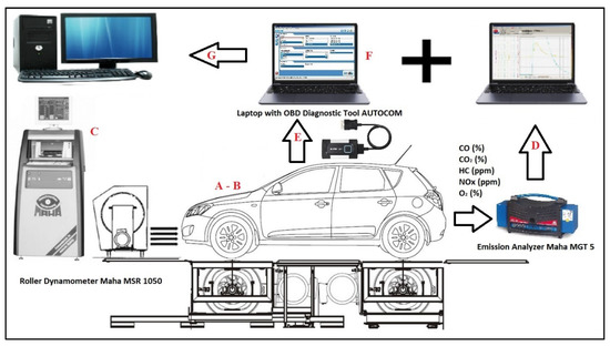 The whole research process is shown in the diagram in Figure 1. The basic technical parameters of the vehicle and engine are indicated in the diagram by positions A and B. These data are contained in Table 1 Position C, D, E, and F in the diagram represent the measuring part of the research task using the measuring technique described below. After the disconnection of each electronic component, an engine power test was performed on the roller power tester (C). The results were compared with a reference measurement when no failure was simulated on the engine. Position D indicates the process for measuring exhaust emissions. The emission production was also compared with a reference measurement. We evaluated the production of emissions from several perspectives. The first was to assess the emissions of individual components of exhaust gases or whether they do not exceed a set limit. The second was to monitor the fault memory of the engine control unit (E). The memory of faults was monitored due to the ability of the vehicle to perform regular emission checks during vehicle operation. During the emission check, no fault with the designation P0XXX must be recorded in the fault memory. The last factor we observed was the display of the MIL (malfunction indicator lamp) on the vehicle’s instrument panel (F). This signals to the driver a fault detected on the vehicle engine. Between the individual tests, a driving cycle with the vehicle was performed and the fault memory of the engine control unit was checked.