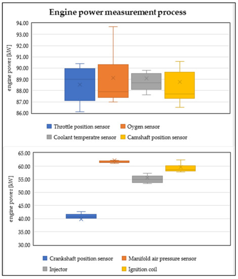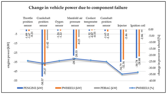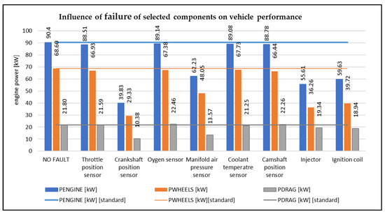 Further, in Figure 2, it is possible to observe how the performance of the vehicle has changed during the simulation of faults on selected electronic components. The most significant decrease in engine power, in the case of sensors, occurs in the event of a fault in the crankshaft speed sensor and the MAP sensor. In the first case, the engine control unit does not have information about the crankshaft speed, but also about the detailed positions of the individual pistons in the engine cylinders. In the latter case, the control unit does not have relevant information on the amount of the intake of air. There is also a significant drop in power in the event of a fault in the injection valve and the ignition coil of one of the engine cylinders. However, these components are actuators of the engine control unit. Their malfunction, logically, significantly affects the process of fuel mixture preparation. These factors also adversely affect the safety of vehicle operations.