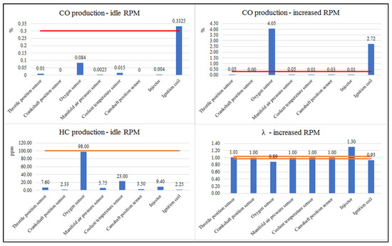 For simplification and correct understanding of the interpreted results, the authors prepared a final table (Table 6), where it is possible to monitor the identified indicators. In the event of individual sensor failures, it is possible to monitor whether the detected value of exhaust emissions complies with the specified regulations. At the oxygen sensor, we monitor the increased production of CO. This production is also increased in the event of an ignition coil and injector failure.