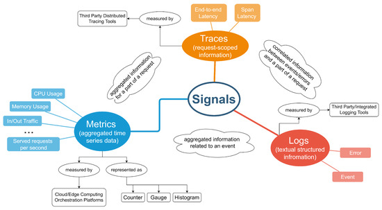 Initially, we clarify the concept of observability by borrowing the definition provided in the area of control theory. According to control theory, observability is a measure of how well the internal states of a system can be inferred from knowledge of its external output [12]. It involves the collection, visualization and analysis of a set of signals. In the case of distributed monitoring and orchestration mechanisms, these signals can be classified into metrics, logs and traces. Their holistic consideration and correlation helps system administrators and software developers to identify and better understand the causes of errors or malfunctions in the provided software (see Figure 1). In this way, observability moves one step forward compared to monitoring mechanisms, since it can provide information regarding the causes of the errors and enable their resolution.