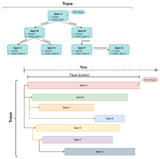 A distributed application may have a set of distributed traces. As already mentioned, each trace is related to a set of operations that represents a unique transaction. Each one of the operations is defined as a span of the distributed trace. According to the OpenTelemetry specification [15], a trace can be thought of as a directed acyclic graph (DAG) of spans, where the edges between spans are called references. Each span has a descriptive name related to the operation that it supports, a start and end time, a set of tags (optional field) for collecting additional information and a span context that encapsulates implementation details. The definition of the spans that constitute a trace follows a hierarchical approach, allowing the assembly of multiple spans into a complete trace [15]. Different types of relationships may be defined between spans. A span may reference zero or more other span contexts, based on two types of references, namely the ChildOf and the FollowsFrom references [15]. In the ChildOf reference type, a parent (or root) span may include a set of child spans. In the FollowsFrom reference type, a sequential execution of spans can be defined. By considering both reference types, a specific path is created for showing how a particular transaction is executed through the numerous components that make up the application (Figure 3).