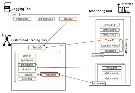 Based on the information for the container and the timestamp, we can enrich the dataset with information provided in the form of metrics. These include deployment metrics given by the monitoring mechanisms of the orchestration platform, exemplars and application metrics provided through the instrumentation library. In the case of the deployment and application metrics, information related to the metric name and value in each container is associated with the relevant information from the distributed tracing tool. In the case of exemplars, correlation is also supported through the metadata that accompany each metric, including the trace ID.