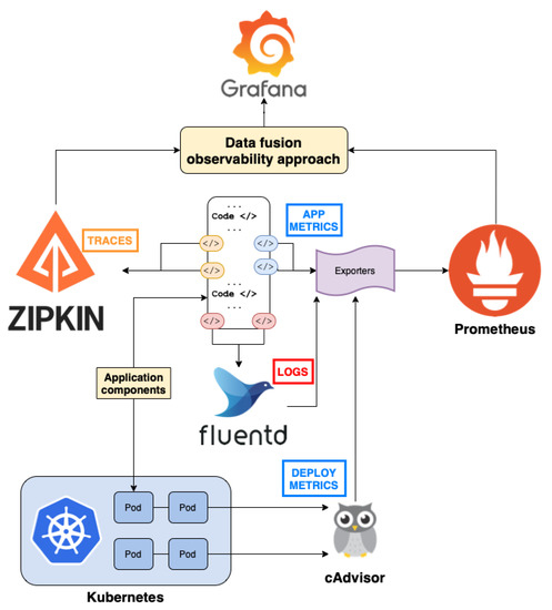 - Marie-Magdelaine, N.; Ahmed, T.; Astruc-Amato, G. Demonstration of an observability framework for cloud native microservices. In Proceedings of the 2019 IFIP/IEEE Symposium on Integrated Network and Service Management (IM), Arlington, VA, USA, 8–12 April 2019; pp. 722–724. [Google Scholar]