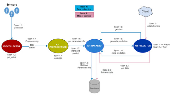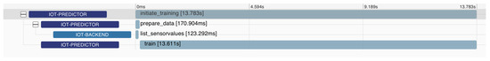 Two main traces of the distributed IoT application have been identified and selected for analysis purposes, as depicted in Figure 6. The first trace (trace 1, consisting of the spans 1.1 to 1.11) supports the flow of real-time data collection and analysis. Data are collected from the IoT nodes (spans 1.1 and 1.2), pre-processed (spans 1.3 and 1.4) and stored in the database (spans 1.5 and 1.6). Subsequently, they are sent for analysis (spans 1.7 to 1.10), while the analysis results are also stored in the database (span 1.11). An indicative analysis of this trace through the Zipkin distributed tracing tool is depicted in Figure 7. It can be seen that the largest spans in terms of introduced latencies in the application part are the spans 1.4 (pre-processing data analysis) and 1.10 (prediction process).