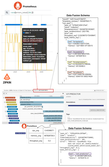 Starting with the production of an error log for the IoT predictor component, we wish to examine in detail what occurs on the specific trace and to identify the source of the error (e.g., whether it is due to a performance issue or a misconfiguration). Through the use of exemplars, the error rate for a specific component can be visualized, providing an overview of the frequency and the timing of the error production. Based on the ID of the trace under analysis, we can examine the introduced latencies per span through the Zipkin visualization tool and identify any irregular behavior. Moving one step further, through the trace ID and the pods identification, we can examine the performance of the IoT predictor component in terms of the error production rate (monitored in Prometheus through the use of exemplars) and the associated usage of resources from this component in the pod where it is deployed (relevant metrics in Prometheus). A holistic analysis can take place and lead to meaningful insights for the system administrators and/or the application developers, similar to the conceptualization that was presented in Figure 2.