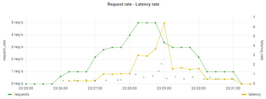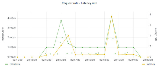 In Figure 10 and Figure 11 we present the end-to-end latencies in trace 1 with regard to the request rate for the smooth and the bursty workload scenarios. For the latencies, we present the exact latency value based on the collection of exemplar metrics (as shown by the grey dots) and the latency rate (as shown by the yellow line). In both the smooth and the bursty workload, it seems that the end-to-end latencies follow the trend of the relevant workload, with a small delay in the appearance of spikes. This is not a desirable behavior, given that the change in the values of the latency may have a direct impact on the overall QoS of the provided application. A potential corrective action involves the application of a scaling policy for part of the application graph components (or microservices). Further examination of the main source of latency across the various spans of the trace is required. This is possible, since through the use of exemplars we obtain information for the exact trace ID for each latency value, and we can examine in detail the relevant request within the tracing tool.