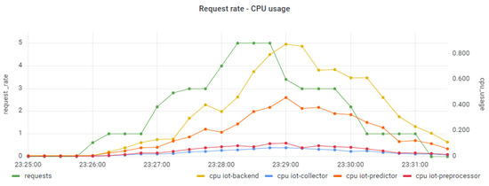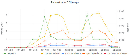 Moving one step further, we examine the resource usage (CPU, memory) trends per component of the distributed IoT application. It should be noted that, in our case, each pod is managing one application component and is packaged in one container. In Figure 12 and Figure 13 we present the CPU usage per application component with regard to the request rate for the smooth and the bursty scenarios, respectively. In both cases, it seems that the CPU usage follows the trend of the relevant workload for all the application components. Higher levels of CPU usage are seen for the IoT Backend and the IoT Predictor components, proving indications of the need to apply scaling policies in both components to better serve the relevant workload and avoid failures in the processing of requests. In the case of the IoT Backend component, scaling is mainly required due to the high usage of CPU resources (up to 80%). In the case of the IoT Predictor component, scaling is required due to the increased latency that is associated with this component, as identified in the trace analysis part in Figure 7. To confirm this statement, a linear regression model was produced for examining the correlation between the overall trace duration and the CPU usage of the IoT Predictor component, as depicted in Figure 14. Once again, the realization of such a joint root cause analysis was enabled based on the adoption of the proposed data fusion scheme and the integration of all the collected signals into a unified JSON representation.