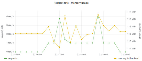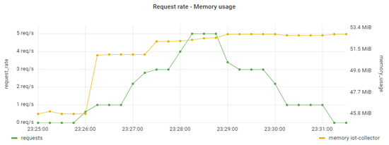 Similar analysis to the CPU usage was performed for the examination of the memory usage per application component. Indicatively, in Figure 15 and Figure 16 we provide such results for the IoT Collector component (under the smooth workload) and the IoT Backend component (under the bursty workload). It seems that there was no severe impact on the memory usage in serving the relevant requests in all the examined scenarios. This can also be seen in Figure 17 in the linear regression model produced for examining the correlation between the overall trace duration and the memory usage of the IoT Preprocessor component.