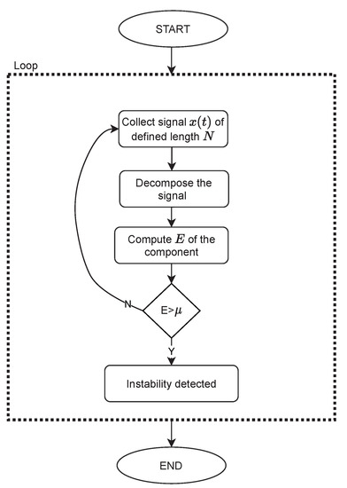 Detection of instabilities is based on a threshold value , obtained as a 99.5th percentile of energy E distribution in stable conditions. By formulating the threshold as a high percentile of the data distribution, rather than the maximum value from the set, the outliers can be disregarded. The operating conditions of a compressor are unstable if for a given signal portion the E value is above the threshold. The threshold value is obtained separately for each set of parameters, including window length, number of siftings and signal length. In practical application, such a system would operate in a loop which would only be interrupted if a detection takes place. The flowchart of the approach is presented in Figure 1.