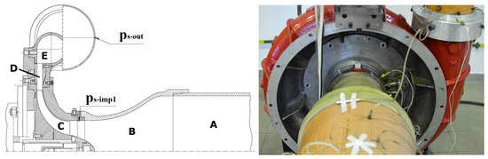 Pressure data were obtained from two locations inside the centrifugal compressor shown in Figure 2. The air was supplied to the compressor through an inlet pipe (A) and Witoszynski nozzle (B), which accelerated the flow before the impeller (C). Downstream of the rotor, air passed through a vaneless diffuser (D), and a circular volute (E). The flow was afterwards directed into an outlet pipe, at the end of which throttling value was mounted.