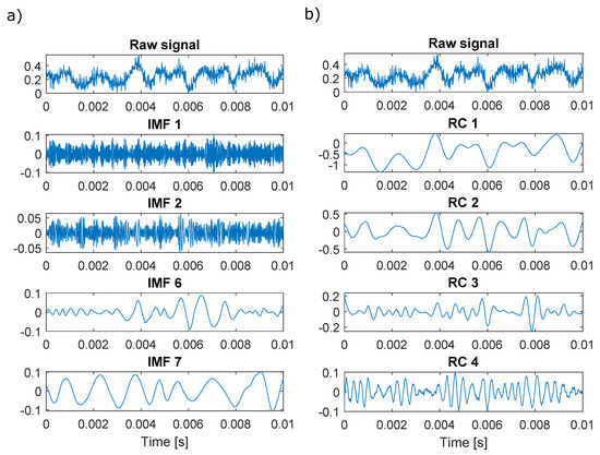 To understand the character of the analysed data and the decomposition, a raw signal along with selected IMFs resulting from decomposition is presented in Figure 3. It can be noticed that first IMFs and first RCs differ significantly in terms of signal frequency. For EMD, each subsequent IMF is of lower frequency, while for SSA, the RCs do not have to be ordered by the frequency. For EMD, the IMFs should be zero-mean simple harmonic oscillations [33], while in SSA, the components can exhibit any behaviour. IMFs 6 and 7 have similar frequencies and amplitudes in the selected signal, which may indicate the possibility of mode mixing. RCs 3 and 4 show beating-like behaviour, which suggests that the signal character changes importantly for the same operating conditions and within a short time contained in the presented time frame.