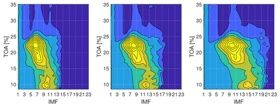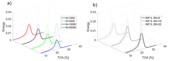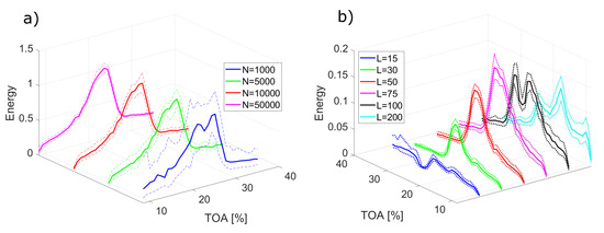 For changing signal length N with constant window length L (Figure 8a), the mean value of energy remains similar, while dispersion grows with increasing signal length, similarly as for EMD. The changes in window length for the same signal length (Figure 8b) affect both mean value and dispersion. No clear relation of dispersion to varying window length is present. Contrary to EMD-based components, the absolute value of dispersion remains similar throughout the analysed range of TOA.