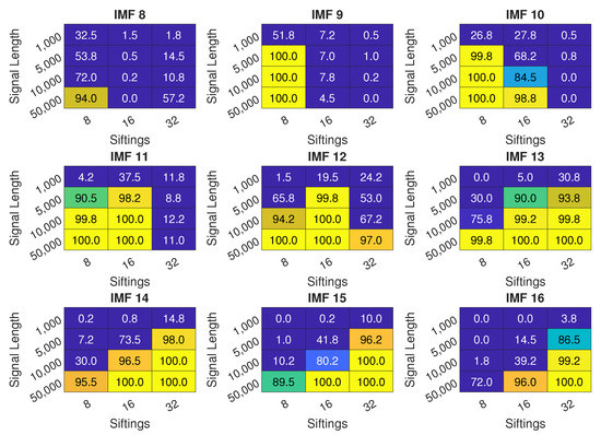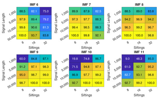 The performance of EMD for varying signal length N and number of siftings is presented in Figure 6. The performance is the lowest for the shortest signal, but still can reach close to 90% for selected IMFs and number of siftings. Increasing signal length results in improvement of the performance. Over 95% accuracy can be reached for N = 5000, over 99% accuracy for N = 10,000 and 100% for N = 50,000. An important observation is that the best-performing IMF changes with the number of siftings. For = 8, IMF 6 provides the best performance, with IMF 7 being only slightly worse. For = 16, the best is IMF 8, with 7 and 9 following closely. For = 32, IMF 9 is the best, closely followed by 10 and 11. The overall trend is that the feature of interest is pushed towards higher IMFs due to IMFs having narrower frequency spectrum.